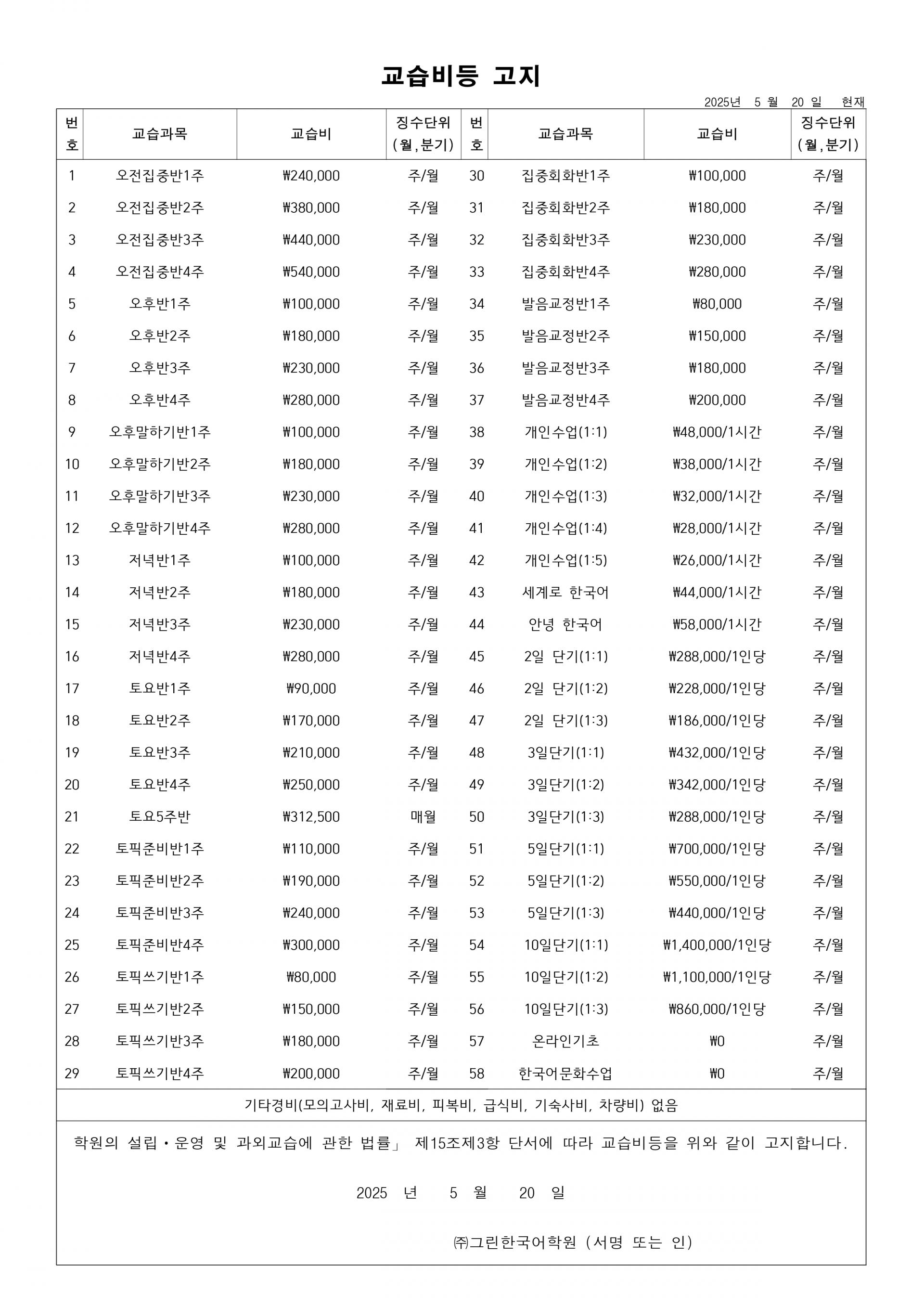 Updates and news Notice of Tuition Fees and Other Charges at Green Korean Language Institute as of May 2025
